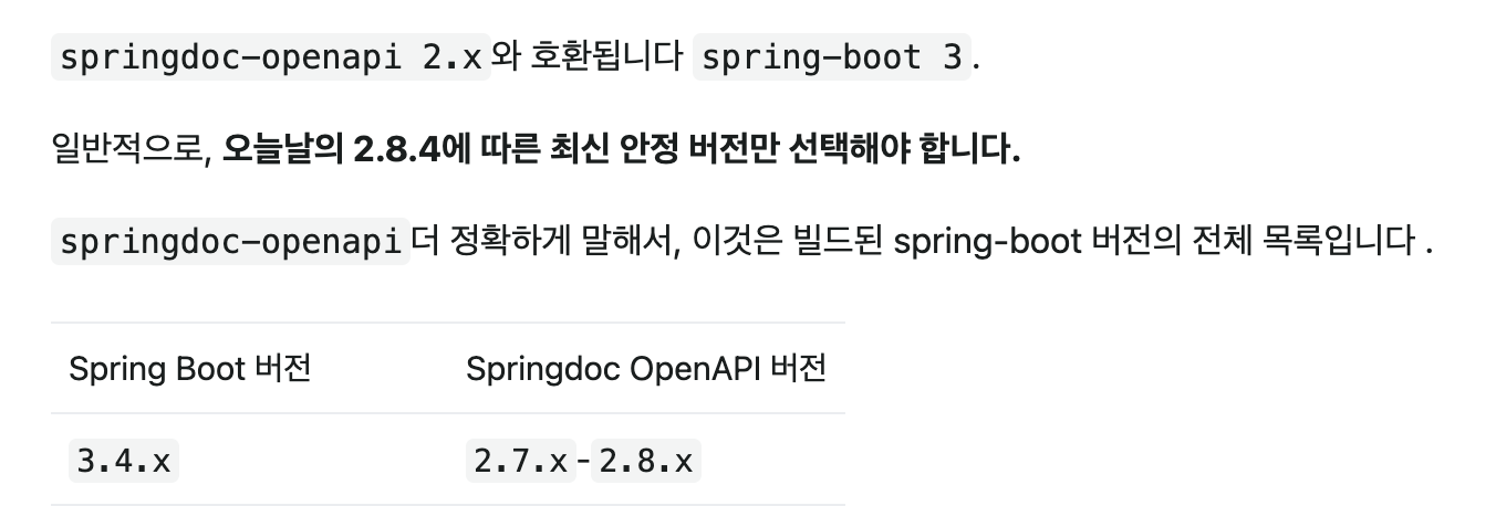 스프링부트 버전 3.4.x부터는 2.7.x - 2.8.x 버전을 사용해야 한다고 springdoc-open api 레퍼런스의 FAQ에 나와있다!