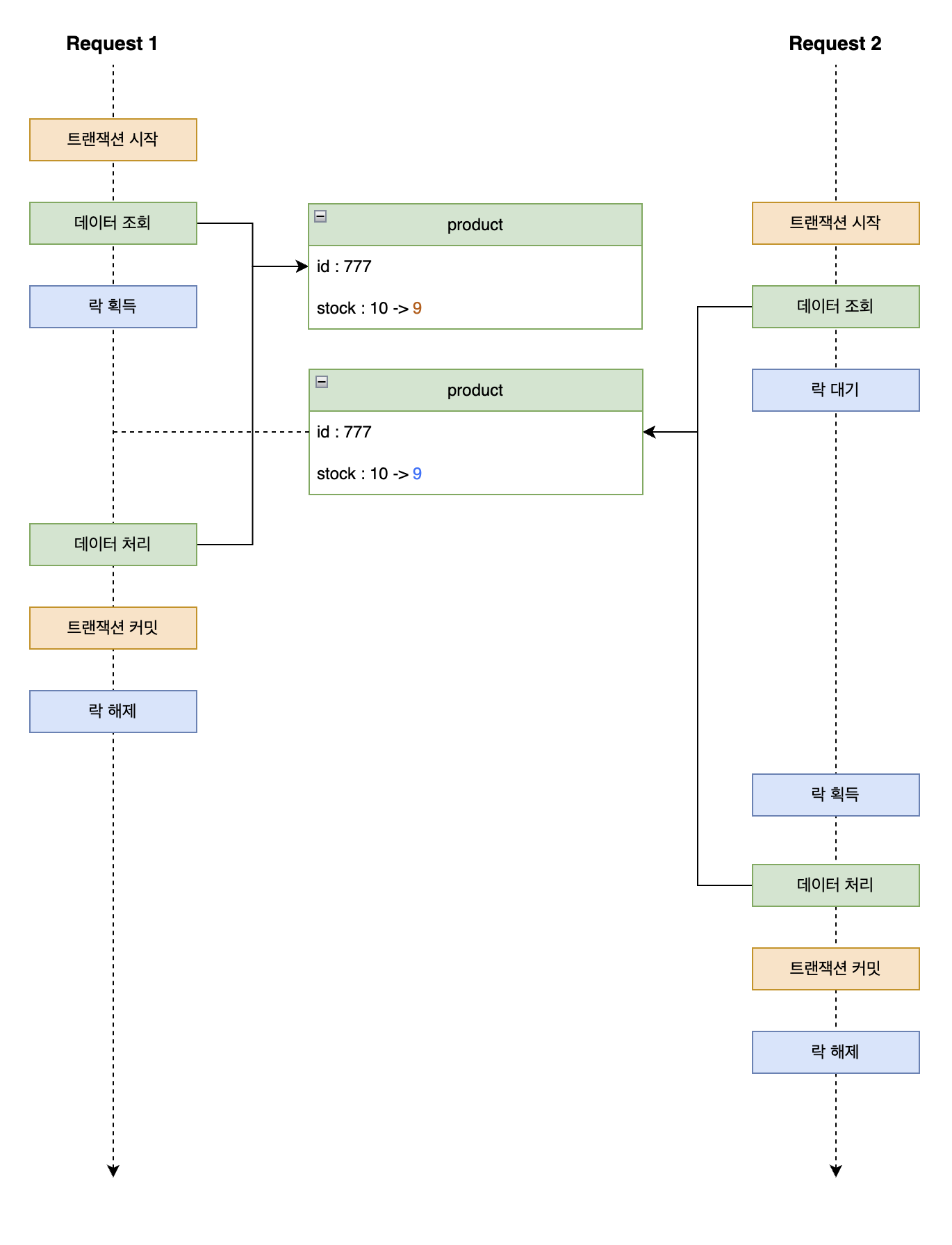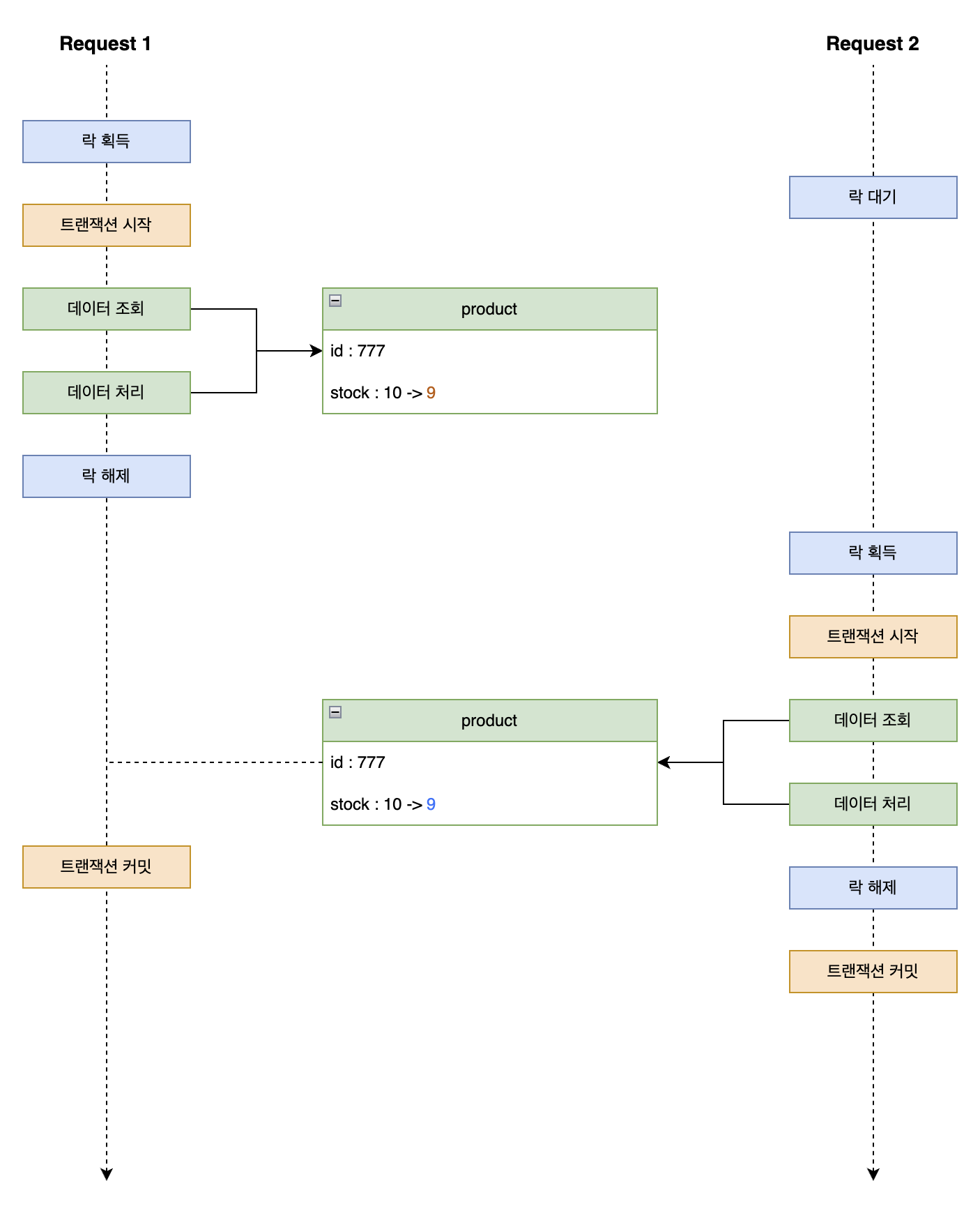 - 트랜잭션이 시작되어 데이터를 조회한 이후에 락을 획득하면, 동시에 처리되고 있는 앞단 트랜잭션의 커밋 결과를 확인하지 못한 채 재고를 조회해와 차감하는 로직을 수행하게 되므로, 정상적으로 재고를 차감할 수 없다.