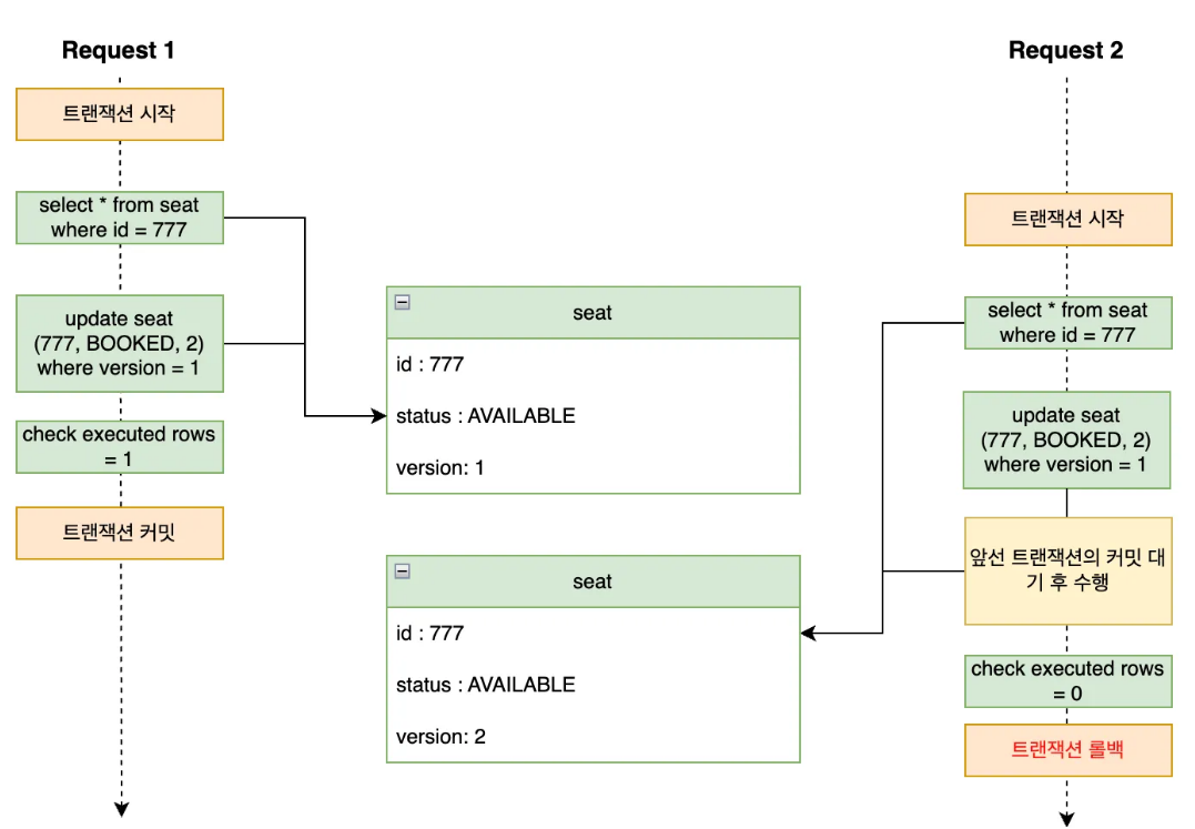- 낙관적 락 : 충돌 발생이 잦은 좌석 예약의 경우엔 재시도로 성능이 저하될 수 있음