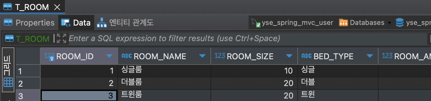 - 객실 테이블 : 주 테이블
