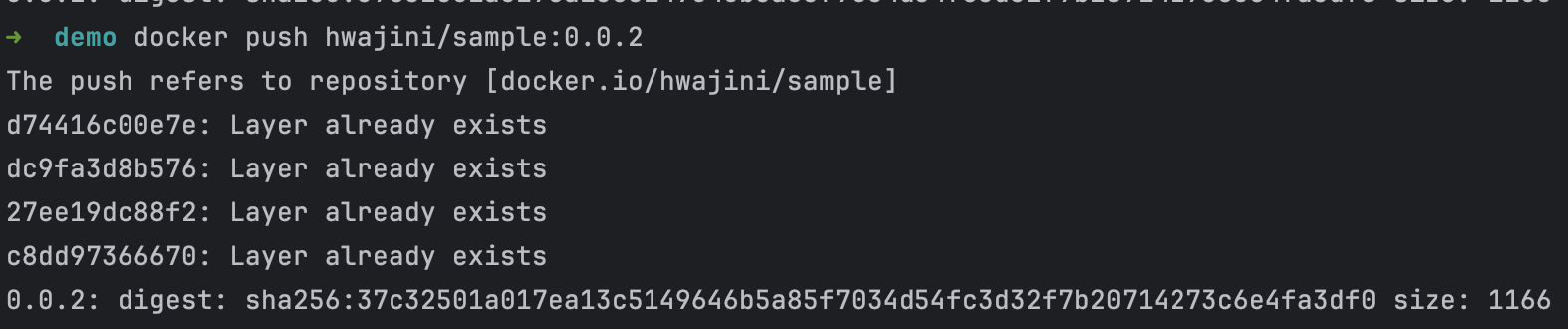 docker push hwajini/sample:tagname 명령을 통해 Docker 허브에 이미지를 업로드 해줍니다.