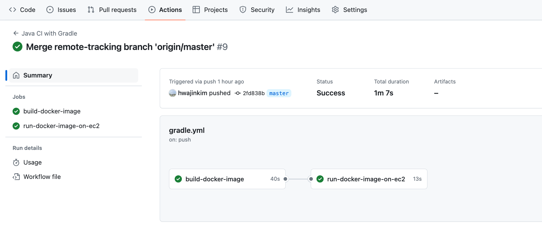 gradle.yml 파일을 수정한 뒤 Commit Changes를 누르고 Actions 탭에 들어가면 위 과정의 진행 상황을 볼 수 있습니다.