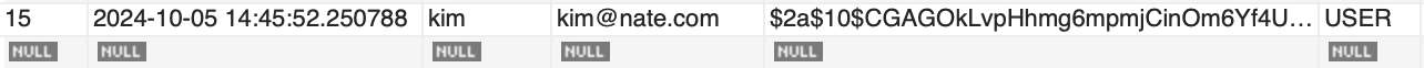 회원가입 시 비밀번호 값이 해쉬값으로 저장된 것을 확인할 수 있다.